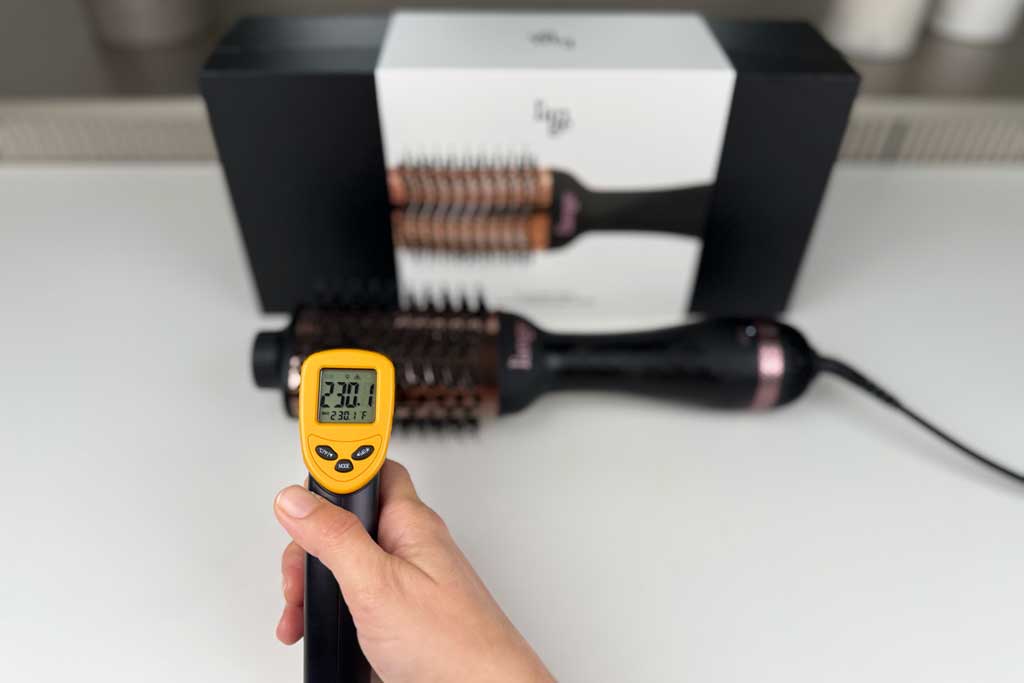 On high heat, the barrel reached about 230°F, placing it in the mid-to-warm range for oval brushes. Paired with its titanium surface and wide barrel, this heat level helps the tool reshape and lift dense, heavy hair efficiently. Because titanium heats and recovers quickly, it creates a more responsive styling environment, letting users form bends or rounded ends with fewer passes—a behavior consistent with Dyson’s research on how controlled, even heat reduces extreme temperature spikes that contribute to cuticle stress.